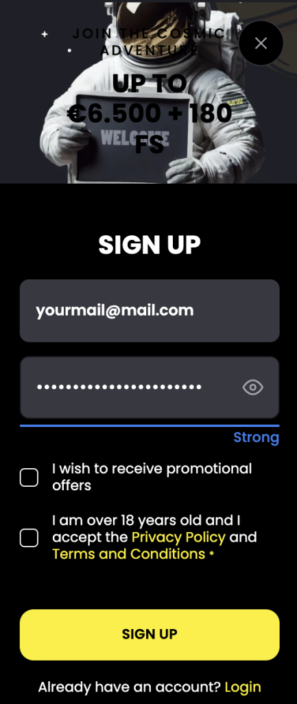 - Fill in the empty fields with your email address and password, then tick the box to confirm that you are eligible to gamble and proceed to the next step;